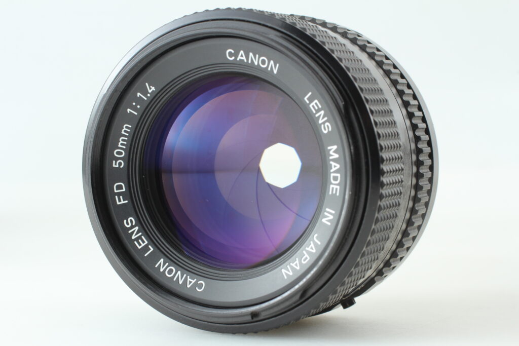 さて、このCanon AE-1にはどんなレンズが必要でしょうか。それはやはり、FD 50mm F1.4レンズです。F値の1.4ですがこれはレンズの明るさを表しています。今のズームレンズに比べると小さくて頼りなく見えるかもしれませんが、実はプロも愛用するほど写りが良いレンズなんです。